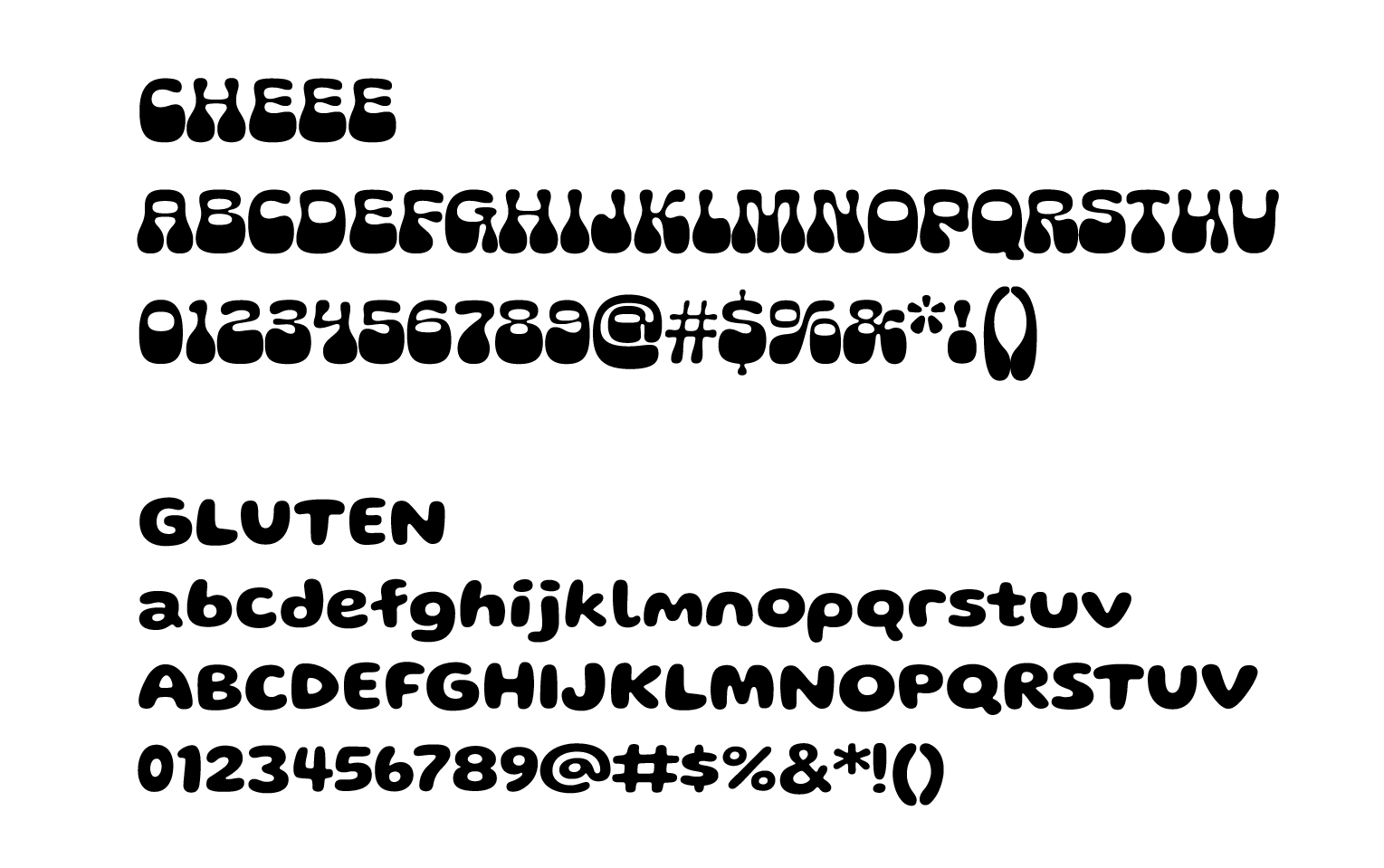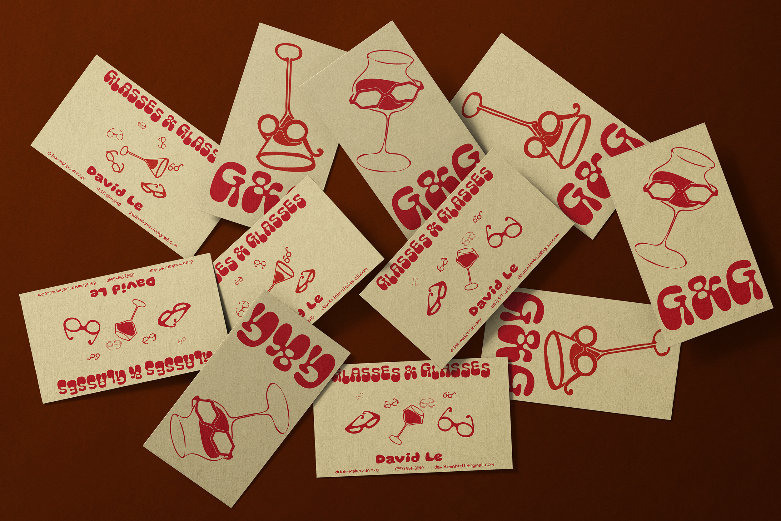 The typography is influenced by food. The main Glasses & Glasses wordmark’s typeface is Cheee, a font created based on the variability of cheese density. The secondary typeface is called Gluten. Not only does the font name fit the theme, but it also has a quirky and cheerful nature that David embodies.